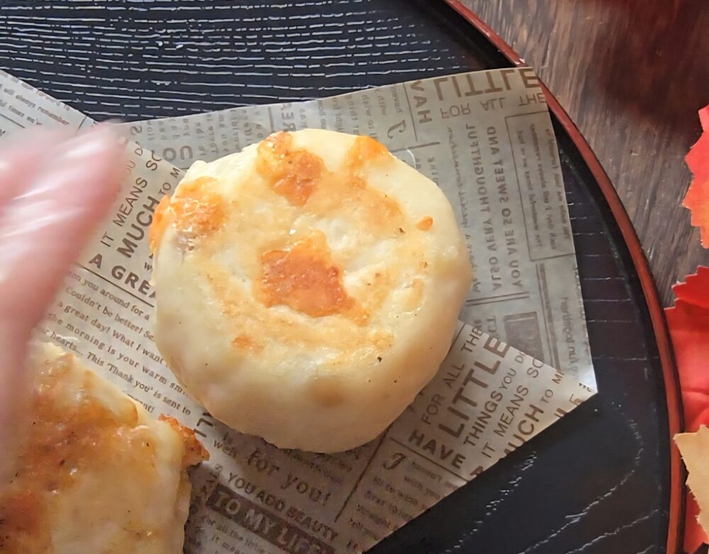 焼きあがった中華まんを500wのレンジで30秒加熱します。カリ餅食感が好きな方はレンジ加熱せず4の工程で出来上がりです。かりっとしながらもふんわりとした食感を楽しみたい方はこの方法を試してみてください